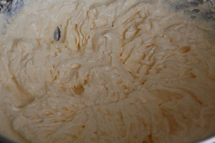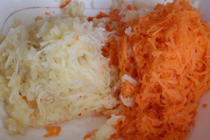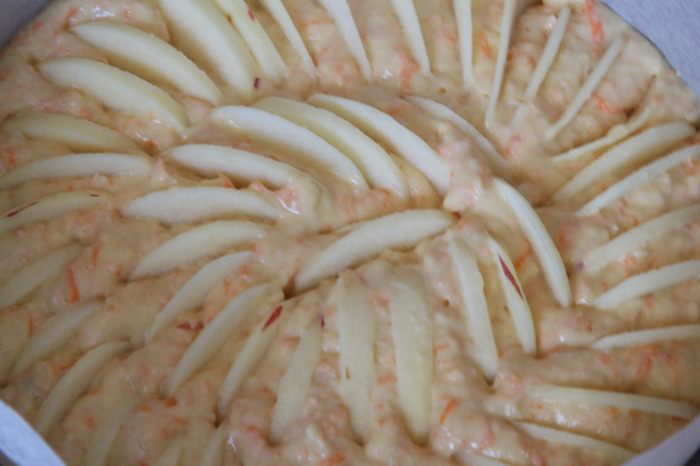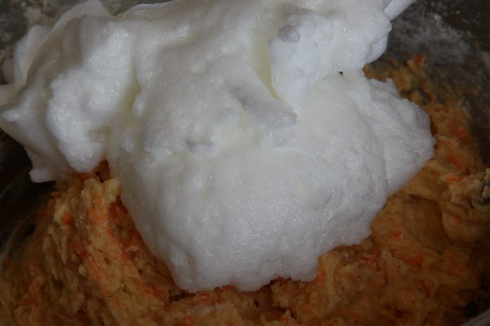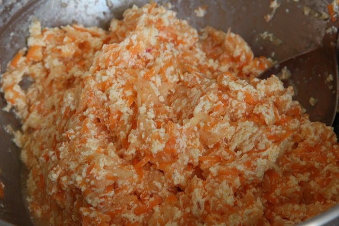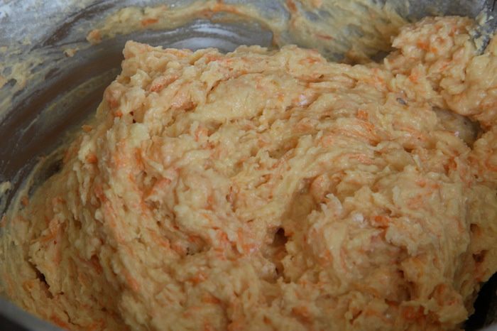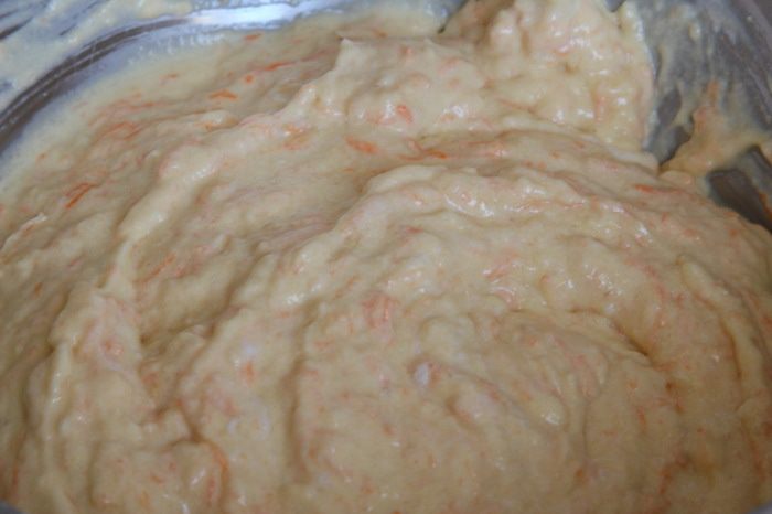 Добавляем муку с разрыхлителем, хорошо вымешиваем. Здесь нужно быть внимательными: тесто должно получиться довольно плотным, но не тугим. Поэтому, если у вас не очень сочные морковь и яблоки, муки добавляйте меньше. Сначала добавьте 100 грамм, перемешайте и потом добавьте до желаемой консистенции. Должно получиться, как на фото.