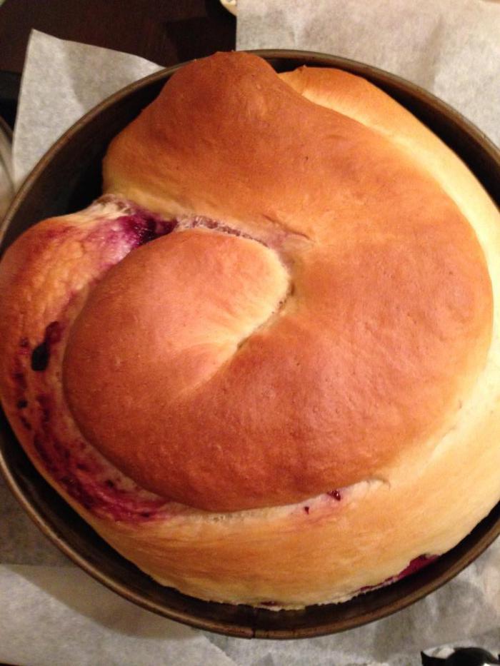 Тесто замешивается на манной каше и с ним приятно работать. От себя добавила прослойку варенья (у меня обожают сдобу с ним) и формовку. А она может быть любой (наши умелицы могут намудрить что-нибудь эдакое). В оригинале тесто просто выкладывается в форму.