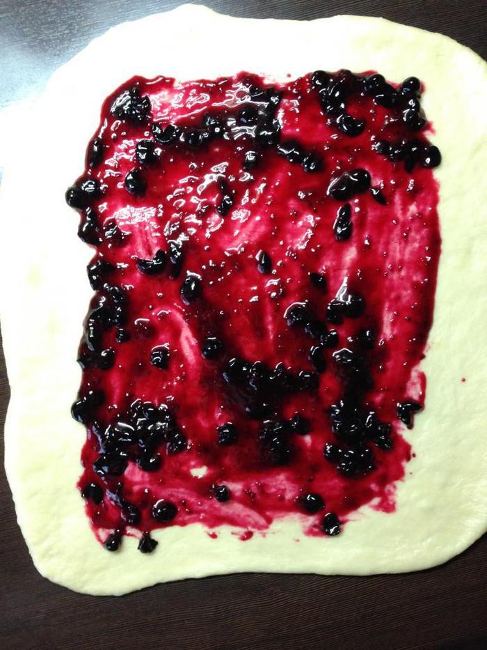 Если делаем с вареньем, то раскатать в пласт, смазать вареньем, отступая от краев по несколько сантиметров.