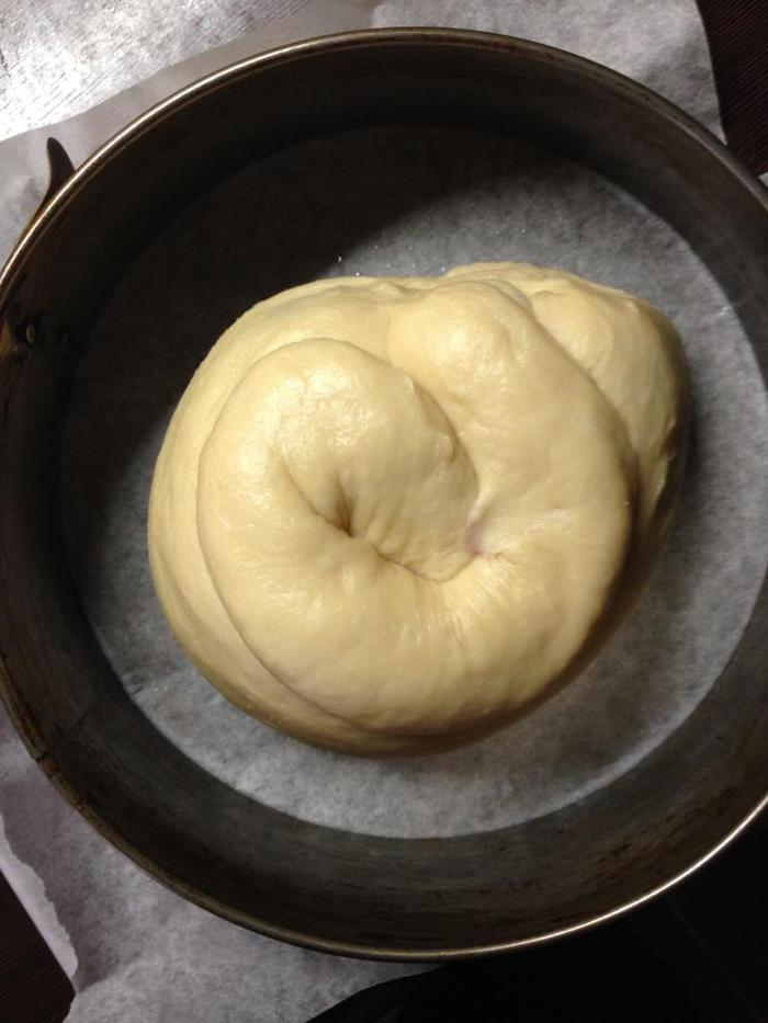 Затем тесто хорошенько обмять и выложить в форму, в которой будет выпекаться булка. Форму смазать маслом.