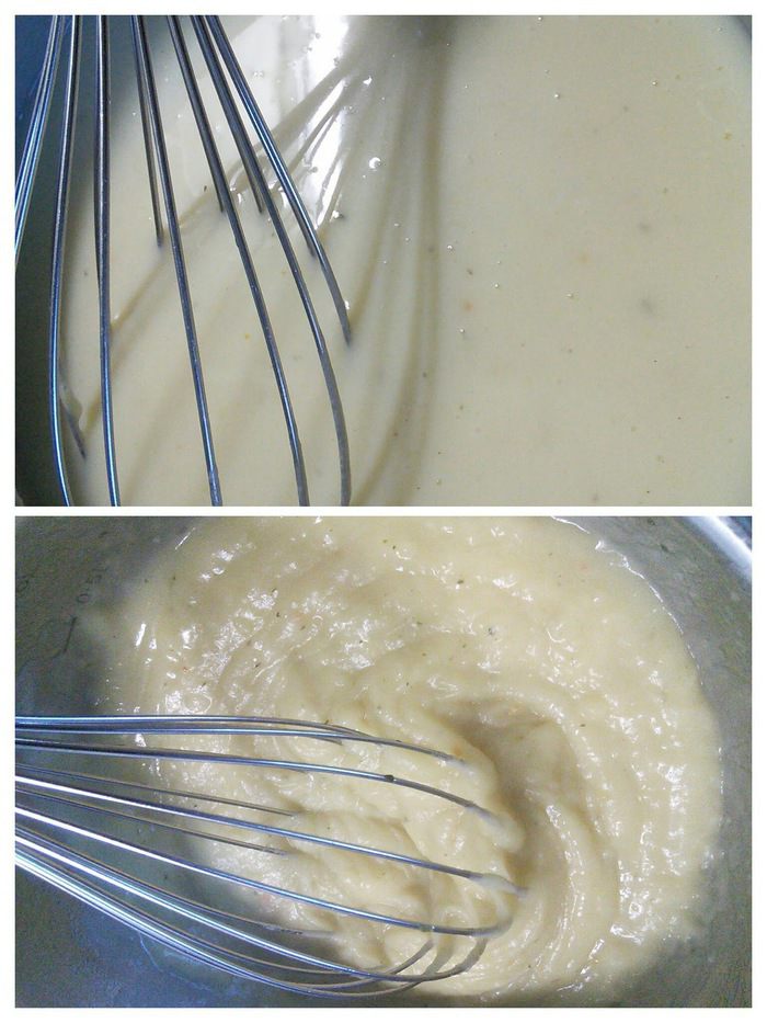 Добавляем разогретый бульон и молоко, не переставая интенсивно вымешивать. Когда соус заварится, посолим, поперчим и добавим щепотку мускатного ореха. Поварим его в течении нескольких минут, снимем с огня и накроем ковшик крышкой.