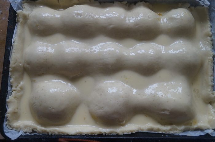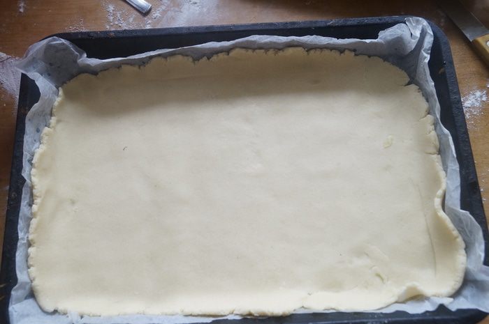 Тесто достать из холодильника и разрезать на 2 части (одну поменьше другую побольше. Меньшую часть раскатать в пласт толщиной 3-4 мм. Выложить в форму для выпечки застеленную пергаментом.