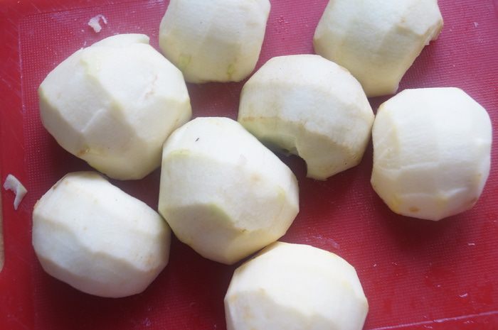 Яблоки вымыть, очистить от кожицы, разрезать пополам и очистить от сердцевины.