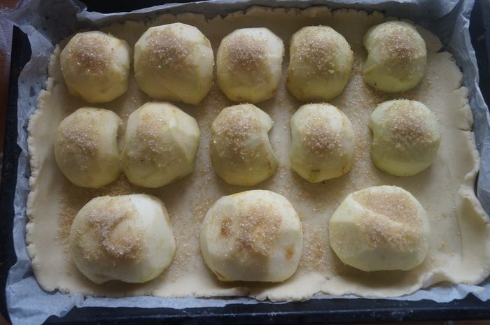 Поверх разложить яблоки, присыпать сахаром и корицей.