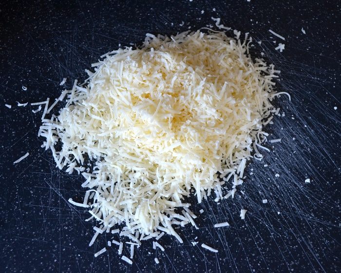 Пармезан натереть на мелкой терке.