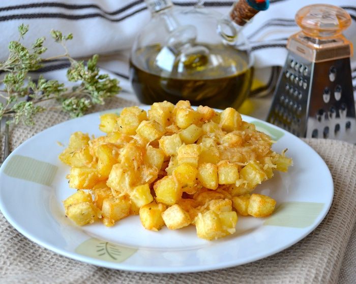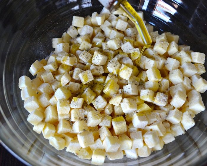 Картофель очистить и нарезать одинаковыми небольшими кубиками. Выложить в миску, положить специи (по вкусу), посолить, поперчить и сбрызнуть маслом.