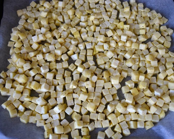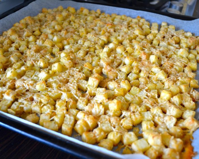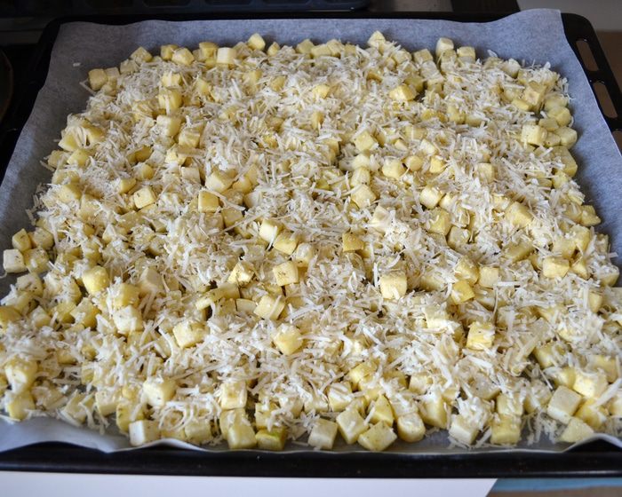 Выложить картофель в один слой на противень, застеленный пекарской бумагой.