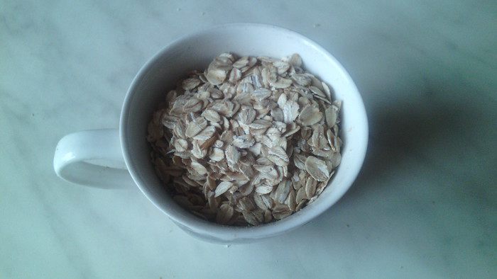 В это время в стакан (кружка) насыпаем овсяные хлопья.