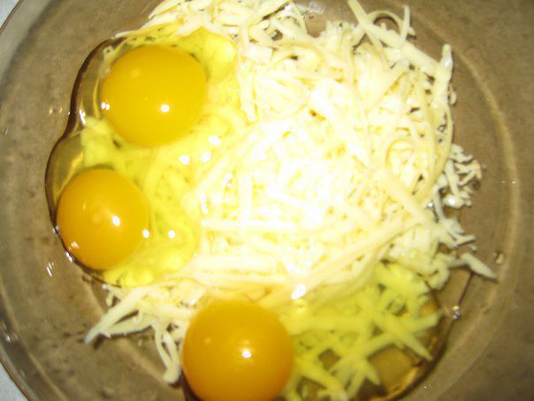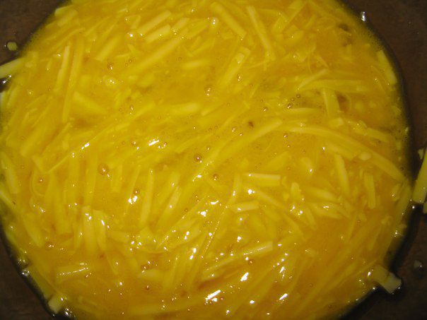 Твердый сыр натереть на терке. Приготовить льезон, взбить яйца, с молоком и сыром.