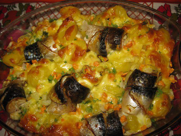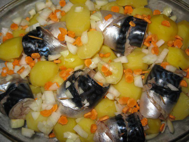 Картофель выложить в форму для запекания. Рулетики из скумбрии на картофель. Наверх морковь и лук.