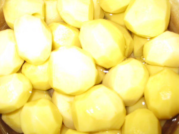 Картофель почистить, если крупный разрезать на 4 части. Выложить в сотейник, добавить немного воды и тушить до полуготовности 15-20 минут.