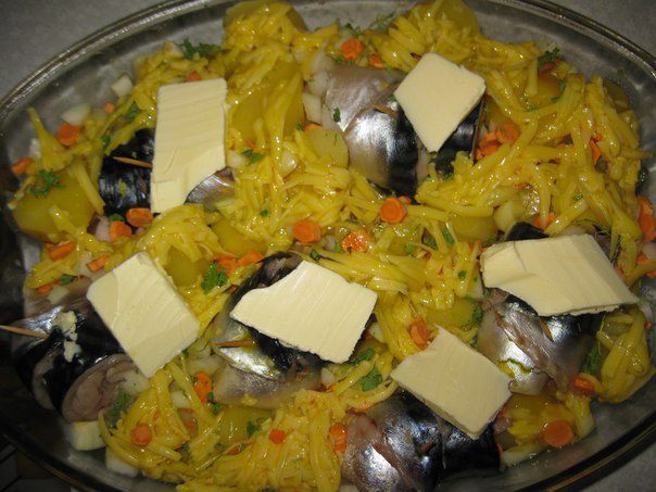 Сверху разложить кусочки сливочного масла. Запекать в духовке 20-30 минут.