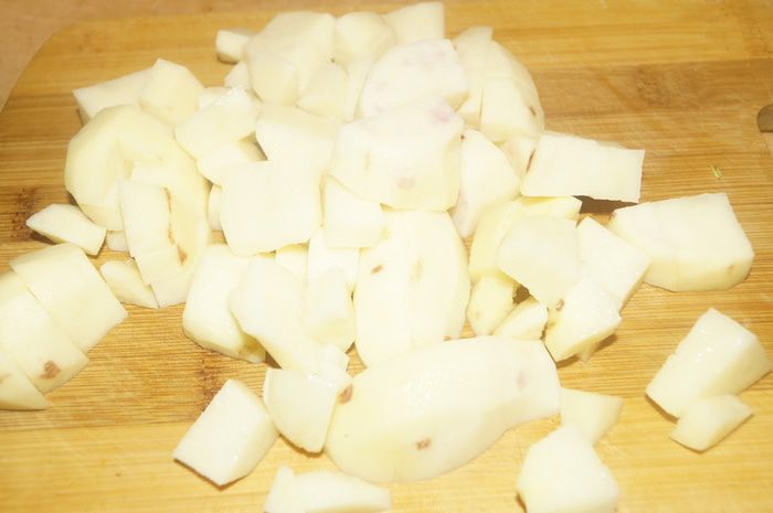 Кубиками нарезать очищенный картофель и в кипящий бульон добавить картофель и тыкву. Довести до кипения и варить на медленном огне.
