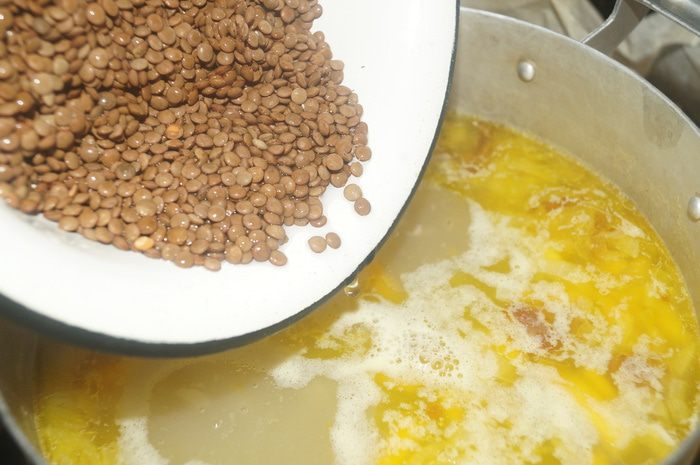Добавить в суп поджарку и чечевицу. Суп посолить и поперчить. Варить до готовности чечевицы. Подавать суп с зеленью и сметаной.