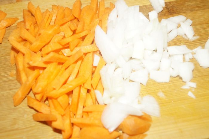 Тем временем нарезать мелко лук и морковь. Обжарить на оливковом масле до золотистого цвета.