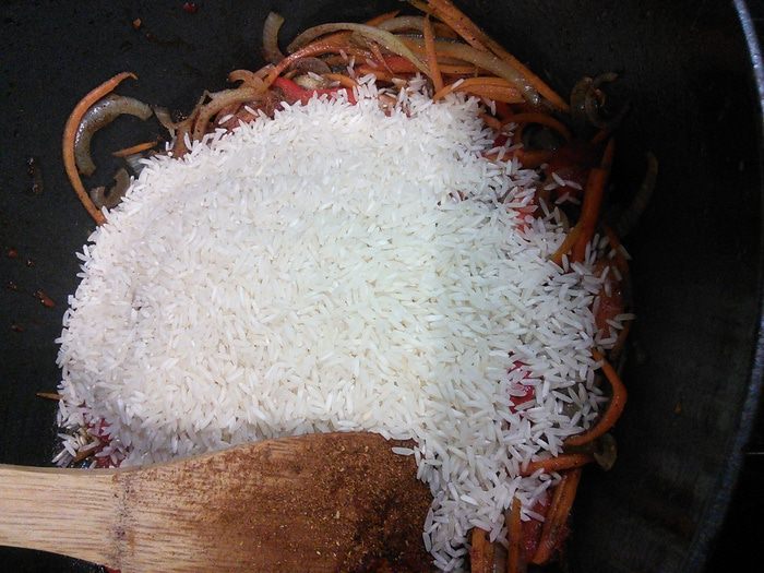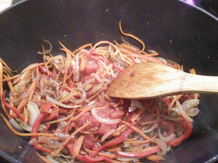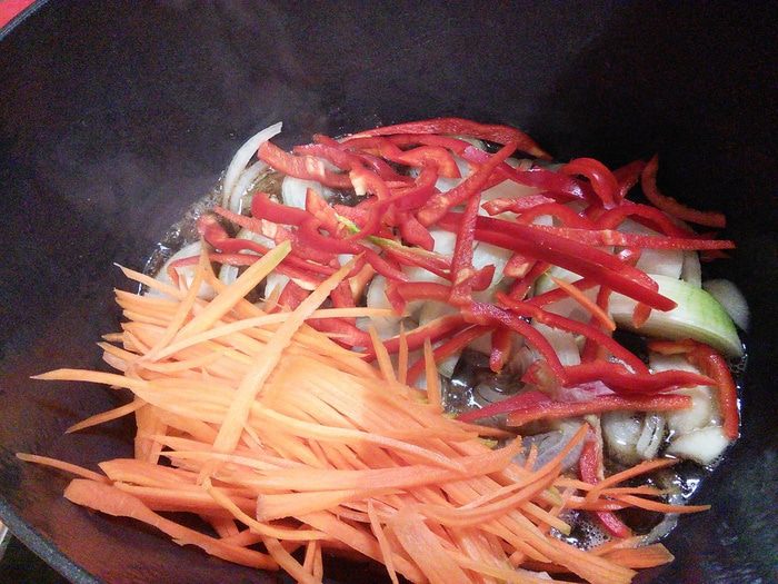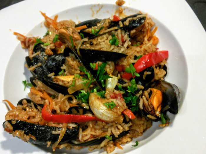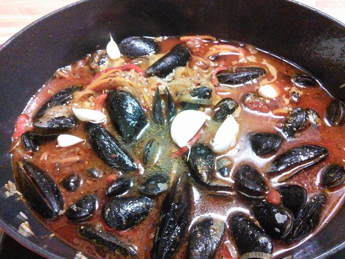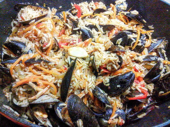 Теперь очередь мидий, уже очищенных и вымытых. Если у вас замороженные, то их желательно заранее разморозить. Залить горячим бульоном (его может уйти чуть больше, главное, чтобы был покрыт жидкостью рис). Чеснок разделить на дольки и не очищая от шелухи вымыть и добавить в плов, посолить и поперчить по вкусу.