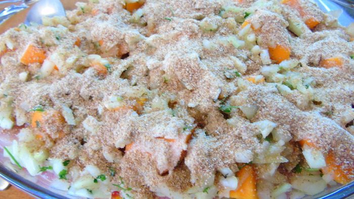 Поверх рыбы выложите смесь тыквы с луком и чесноком. Присыпьте панировочными сухарями. Отправьте в разогретую до 180С духовку на 30-35 минут.