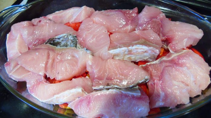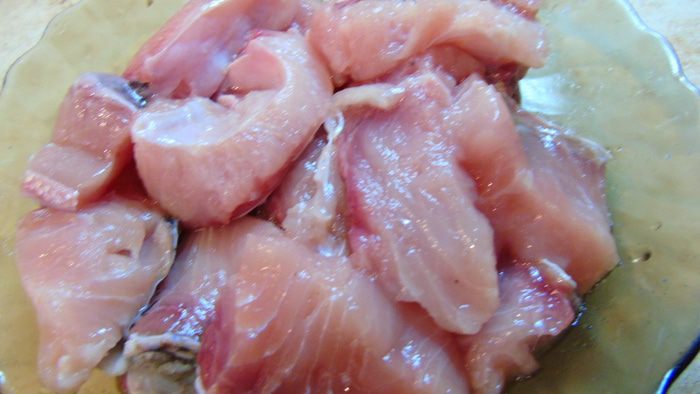 Рыбу нарезать кусочками, посолить и поперчить. Лучше брать филе белой рыбы, я взяла филе толстолобика.