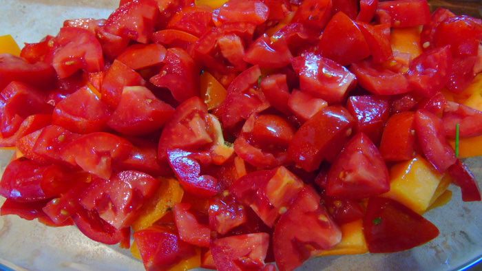 Форму смажьте масло и выложите тыкву, затем перец и помидоры. Посолите и поперчите.