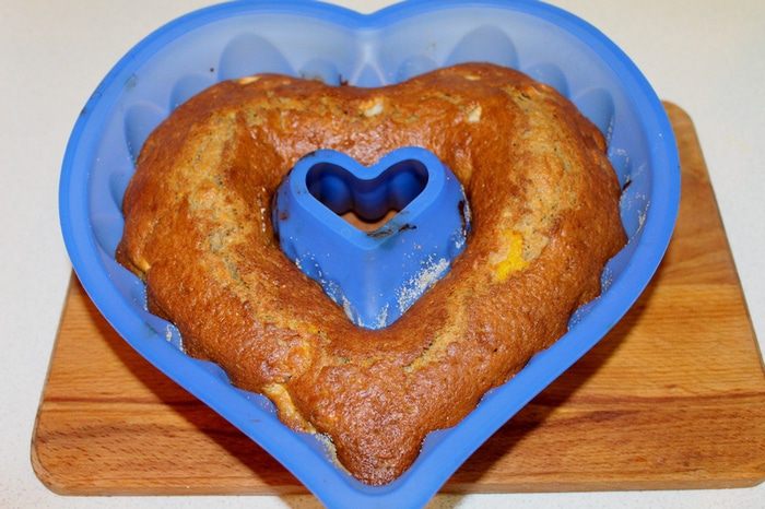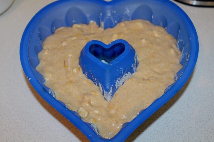 Выкладываем тесто в смазанную форму для кекса, круглую с дырочкой в середине.