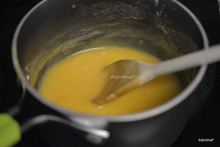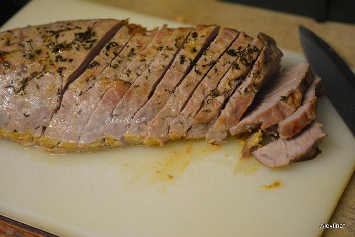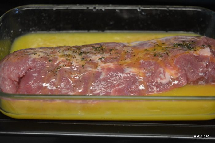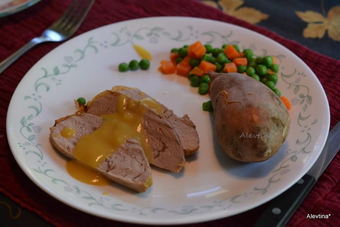 Свинину готовую переложить на блюдо, прикрыть фольгой. Жидкость после свинины процедить и перелить в кастрюльку. Смешать остатки от 1 стакана сока с мукой, сахаром, добавить в кастрюльку. Поставить на средний огонь, как закипит, убавить огонь и помешивать еще 1-2 минуты.