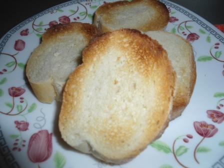 Багет порезать на кусочки и поджарить в тостере. Сбрызнуть оливковым маслом.