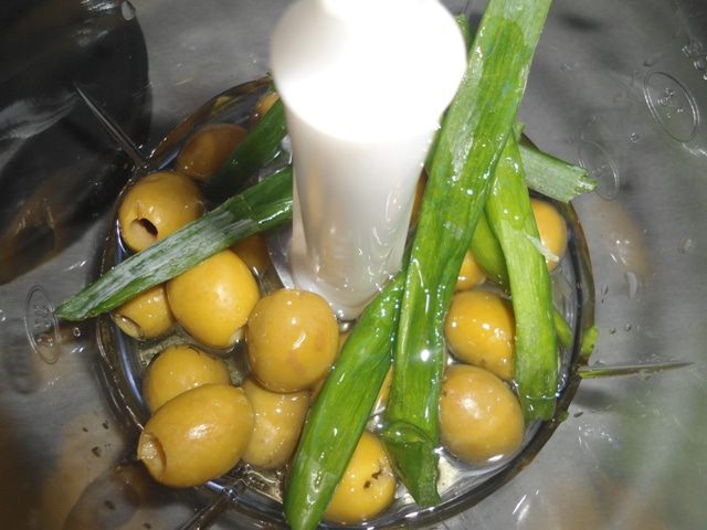 Теперь нам понадобится измельчитель. В чашу выкладываем оливки, капусту, лук и зелень, чеснок и лимонный сок.Наливаем масло и измельчаем.