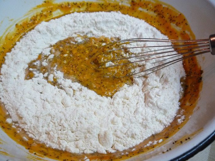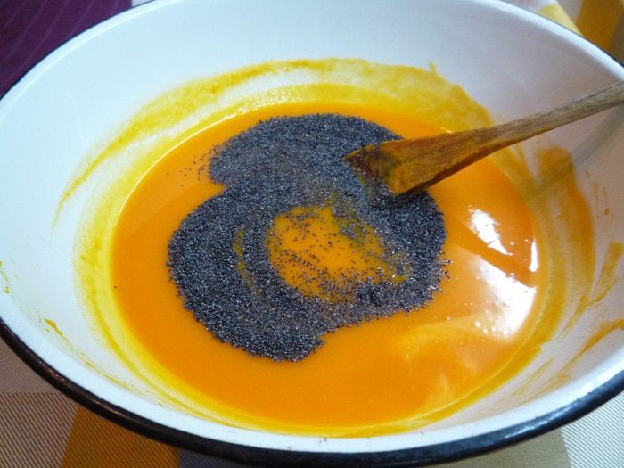 Затем добавляем в тыквенное пюре мак, цедру лимона и молотые пряности (у меня смесь гвоздики, кардамона, ореха мускатного, корицы).