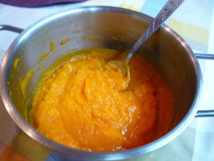 В охлажденное тыквенное пюре добавляем молоко и сахар. Оставляем на 5 минут, чтобы сахар растворился.