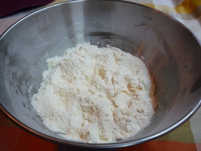 Муку просеиваем, смешиваем с 1 чайной ложкой разрыхлителем, добавляем щепотку соли. Холодное сливочное масло натираем на крупной терке и перемешиваем с мукой до состояния мучной крошки.