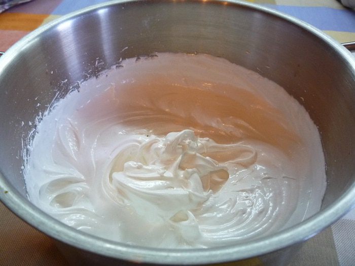 Для крема: миксером слегка взбиваем белки, добавляем сахарную пудру и 1 чайную ложку разрыхлителя. Ставим чашку на водяную баню и взбиваем миксером 10-15 минут.