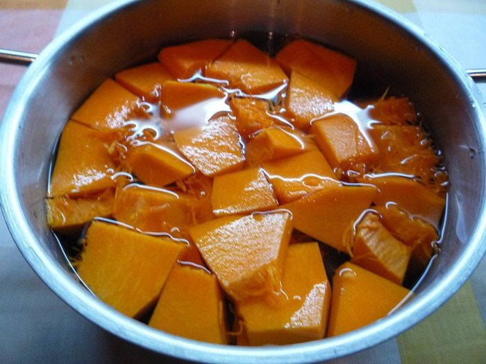 Тыкву очищаем, нарезаем не большими кусочками, отвариваем 10-15 минут, сливаем воду и выкладываем тыкву на дуршлаг, чтобы стекла оставшаяся вода.