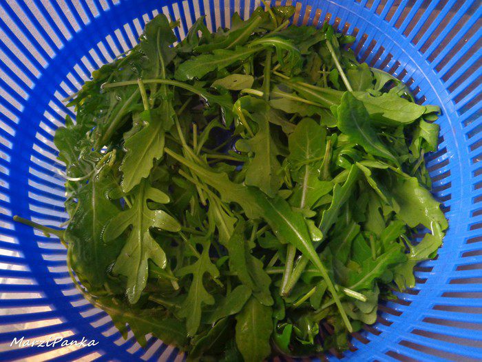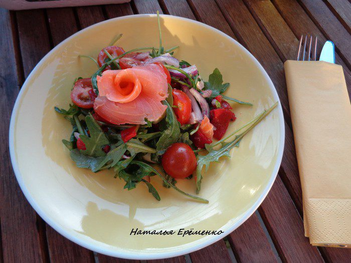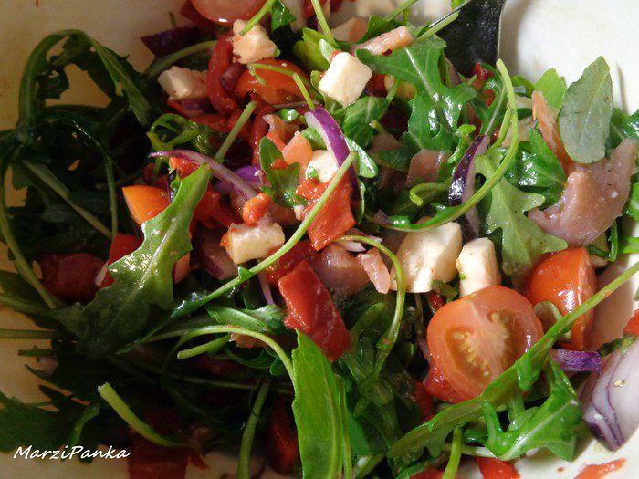 В состав данного салата входят овощи, в том числе грилованный маринованный сладкий перец, который придает особенный вкус этому салату. Моцарелла очень удачно вписалась в этот дуэт, а рукола внесла свежую нотку.