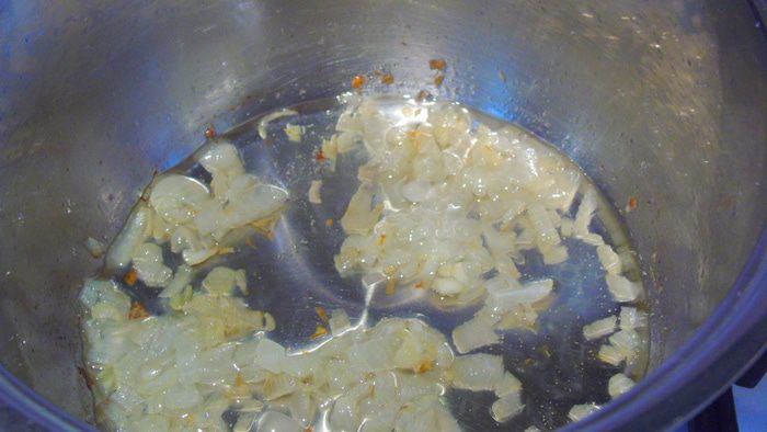 Лук обжариваем на оливковом масле с кастрюле с толстым дном.