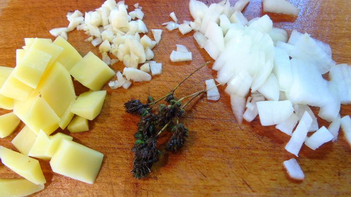 Добавляем картофель, нарезанную тыкву, чеснок и жарим 5 минут на сильном огне. Добавляем тимьян.