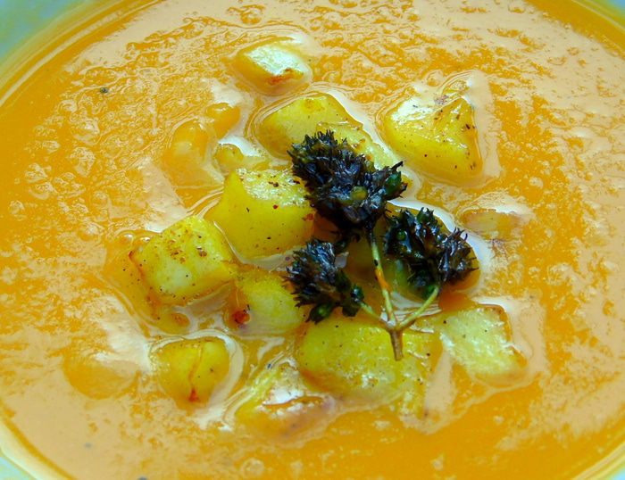 Разливаем по тарелкам, добавляем яблоки и украшаем тимьяном. Подаем и наслаждаемся. Приятного аппетита!!!