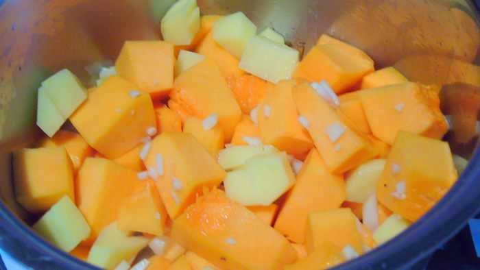 вливаем воду, солим, перчим, доводим до кипения и варим на среднем огне 15-20 минут, до готовности тыквы с картофелем.
