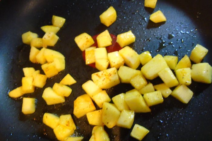 Пока суп вариться, яблоки очищаем, нарезаем кубиками и обжариваем на небольшом количестве масла, присыпав солью, перцем и карри. Яблоки должны стать золотистыми.