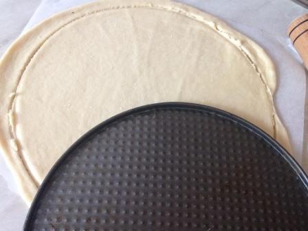 Из 1 на листе пергамента раскатать круг (я обрезала под дно формы 24 см).
