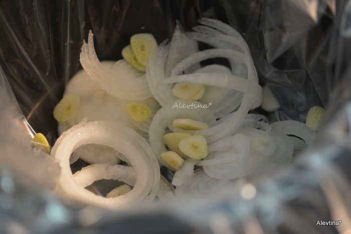 Лук порезать тонко выложить на дно медленноварки, чеснок очистить и добавить к луку.