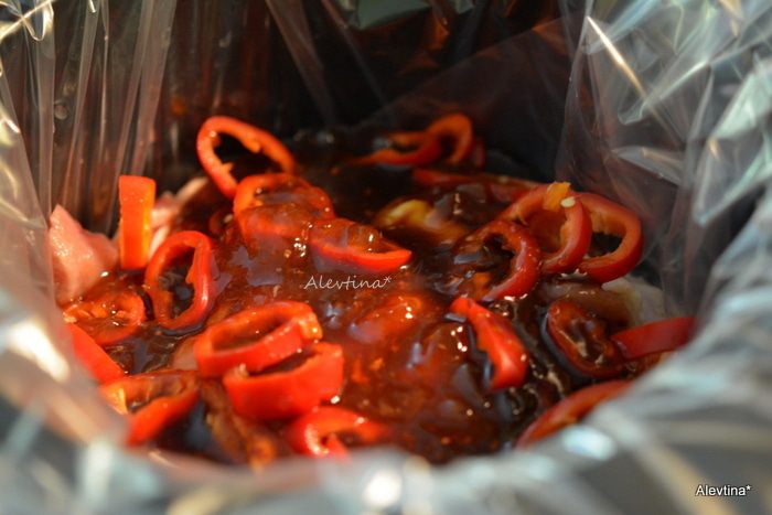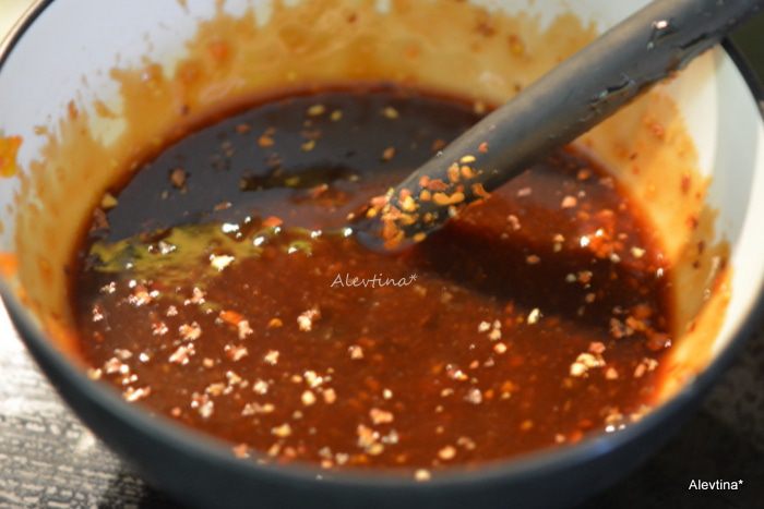 Приготовим соус из абрикосового джема, кетчупа, соевого соуса, имбирь натереть, красный перец хлопьями.