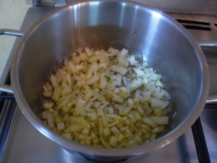 В кастрюлю наливаем оливковое масло, и на маленьком огне обжариваем лук и чеснок до прозрачного состояния около 5 минут.