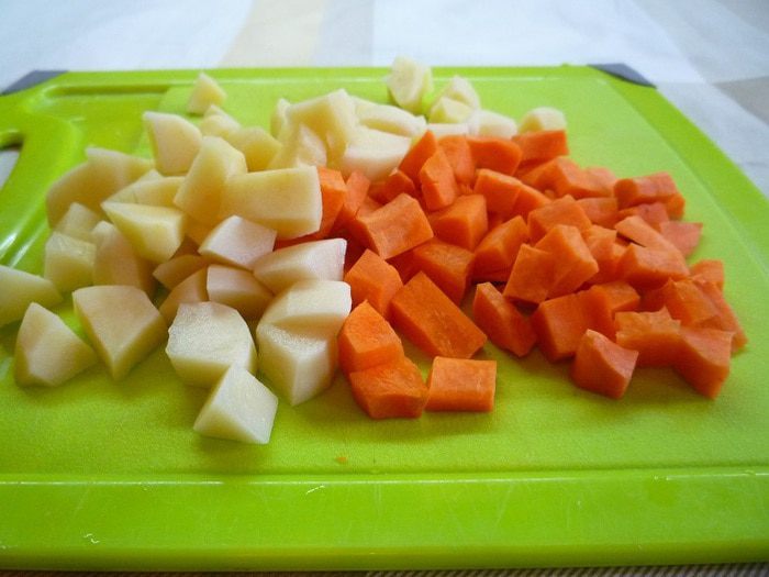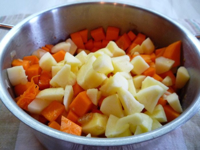 Добавляем к моркови тыкву, картофель и перчик, перемешиваем, затем добавляем яблоко и заливаем кипятком так, чтобы вода еле покрывала наши овощи. Закрываем крышкой и тушим 30 минут.