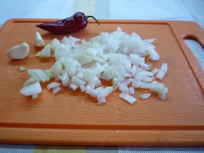 Лук, чеснок и перчик мелко нарезаем. Если суп будут кушать детки, то перчик следует исключить.