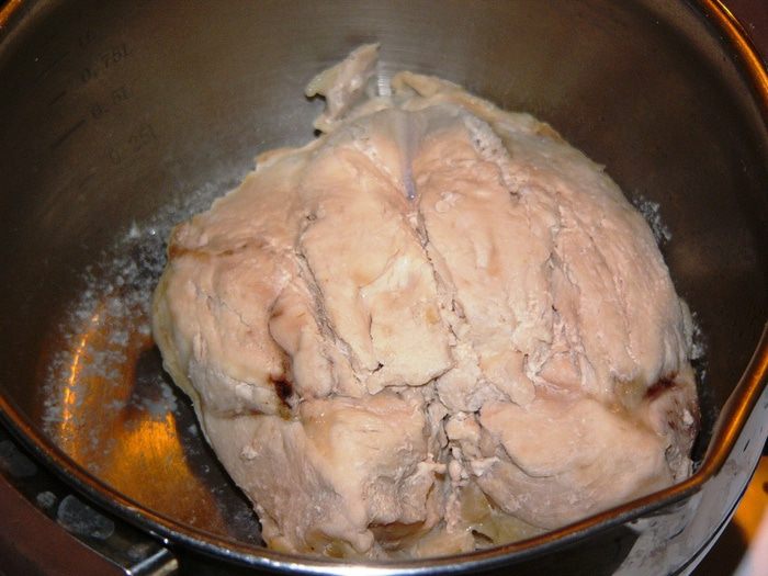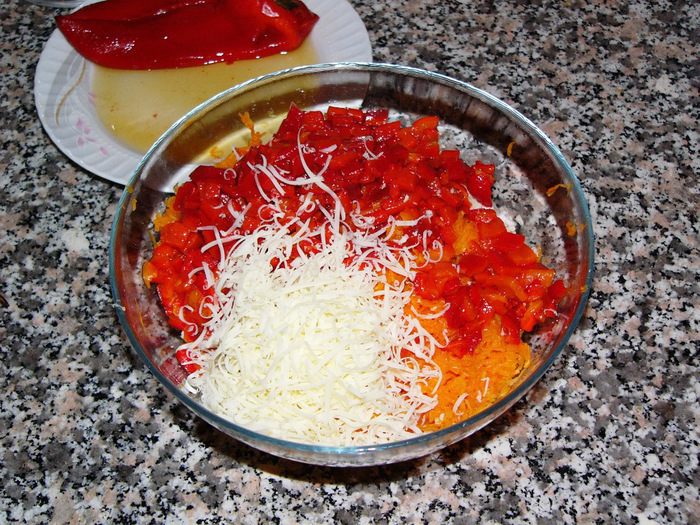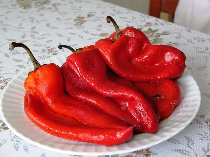 Перец запечь в духовке около 20 минут (следите по своей духовке). Затем сложить перец на несколько минут в целлофановый пакет (будет легче очистить), достать и очистить.