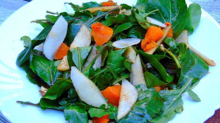 Выложите руколу, сверху кусочки тыквы, груши. Полейте заправкой и посыпьте рубленными орехами. Сразу же подавайте. Приятного аппетита!!!