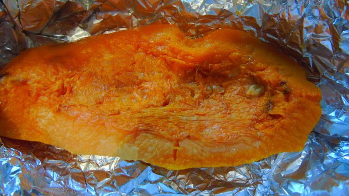 Разогрейте духовку до 220С. С тыквы срежьте кожуру, посыпьте смесью соли, перца и корицы, заверните в фольгу и запеките до мягкости, примерно минут 10.