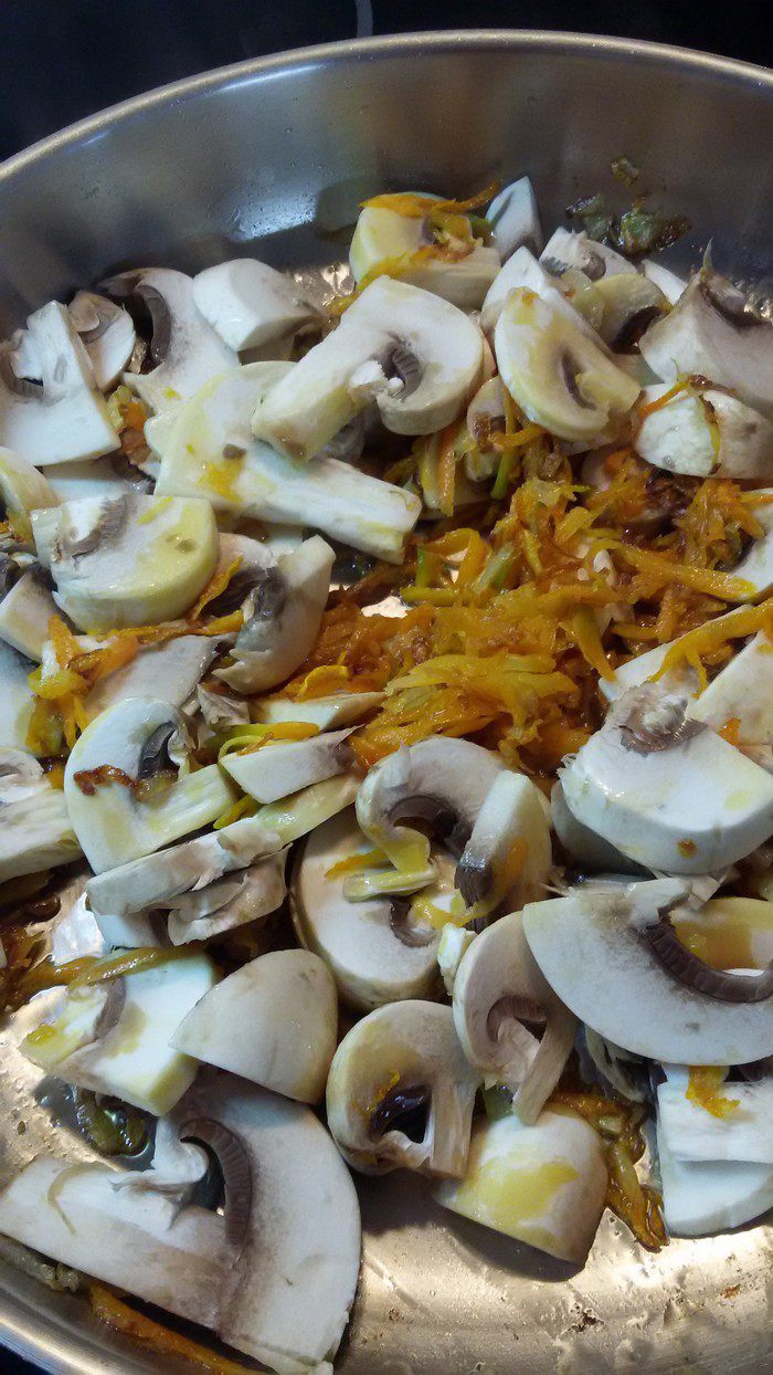 Шампиньоны нарезать пластинками. Добавить к луку и моркови. Все жарить до готовности.