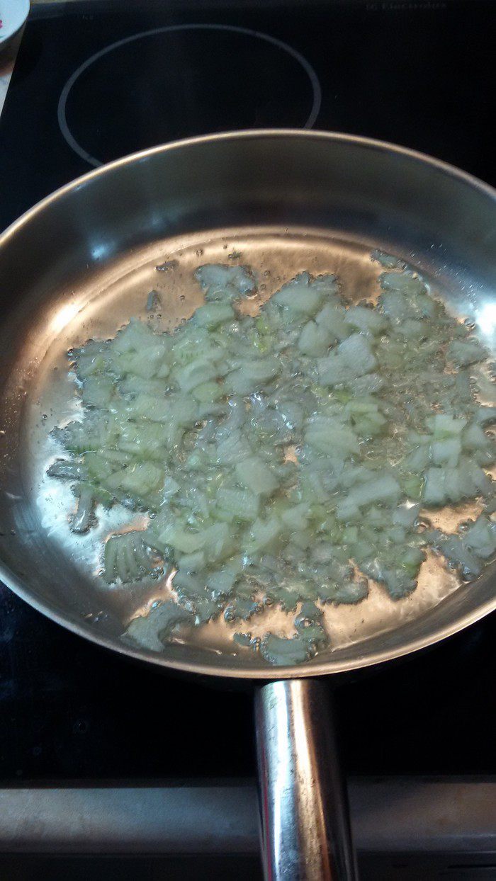 Куриную грудку и яйца отварить. Остудить. Лук мелко нарезать и обжарить до золотистого цвета.