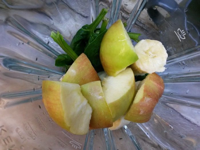 В блендер отправляем банан, яблоко и шпинат. Добавляем воду и лимонный сок. Взбиваем до однородности.